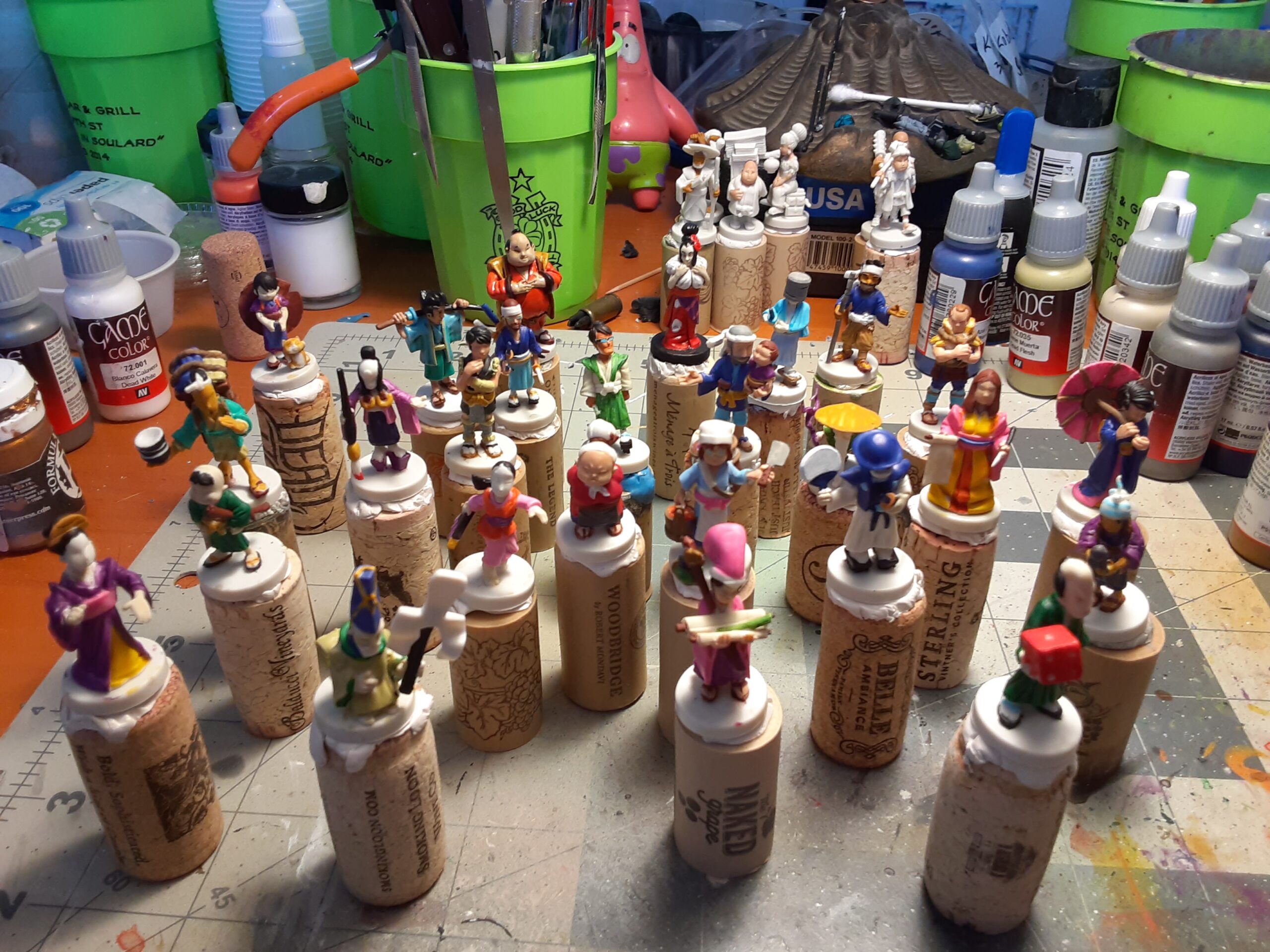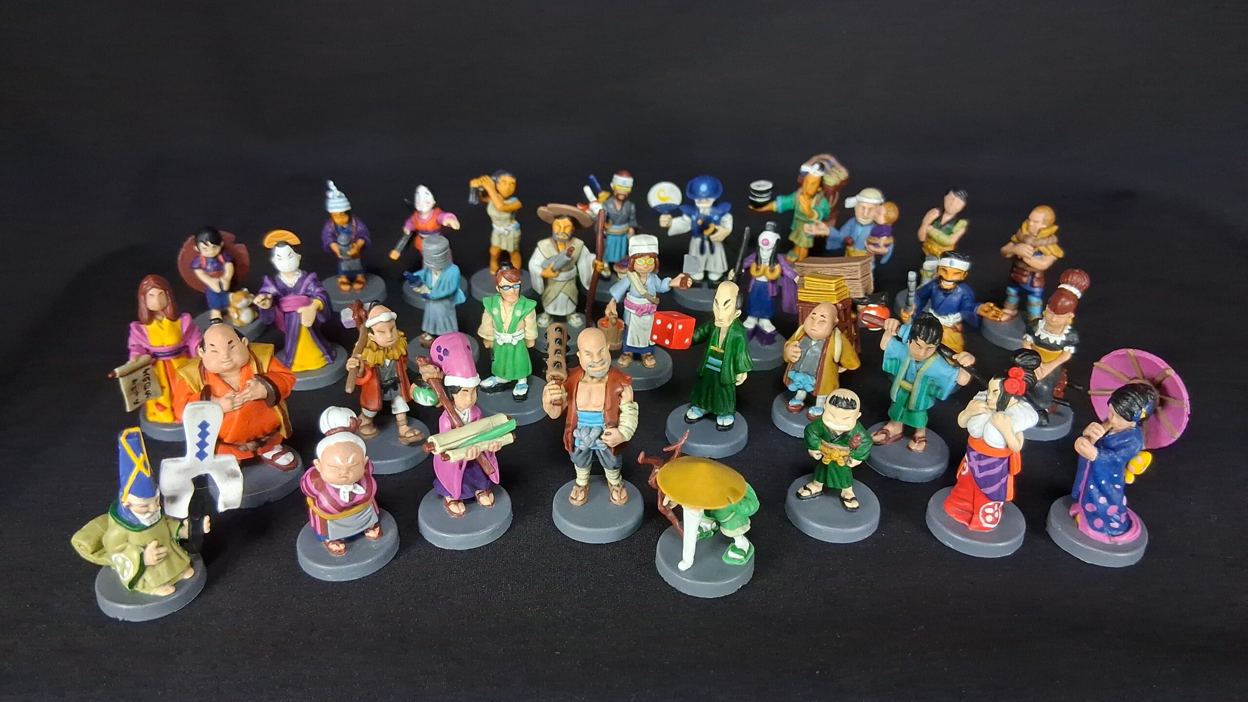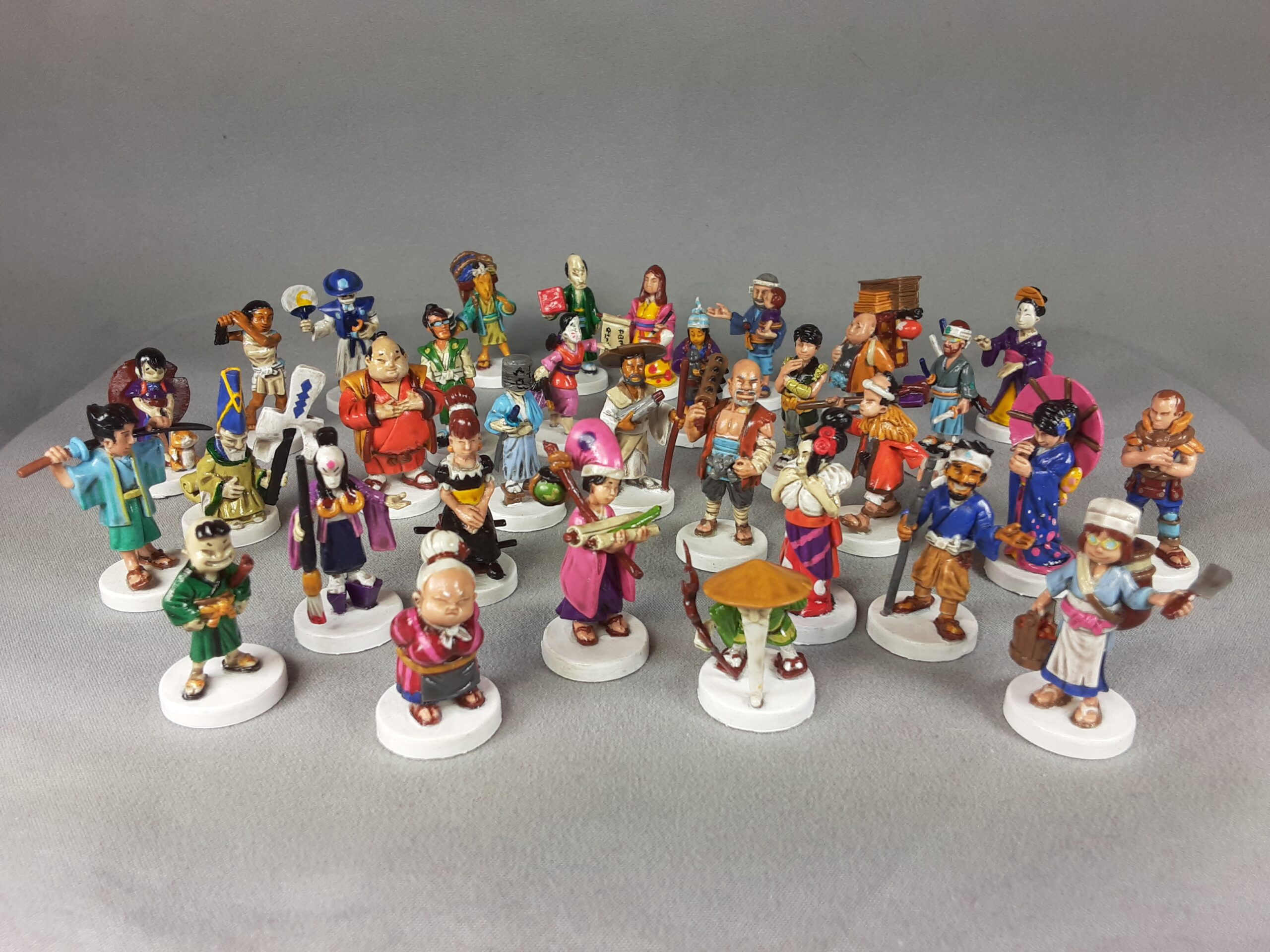 32 game colorful figures for the board game "Tokaido". I've actually done two sets of these, both pictured as well as some works in progress for both.