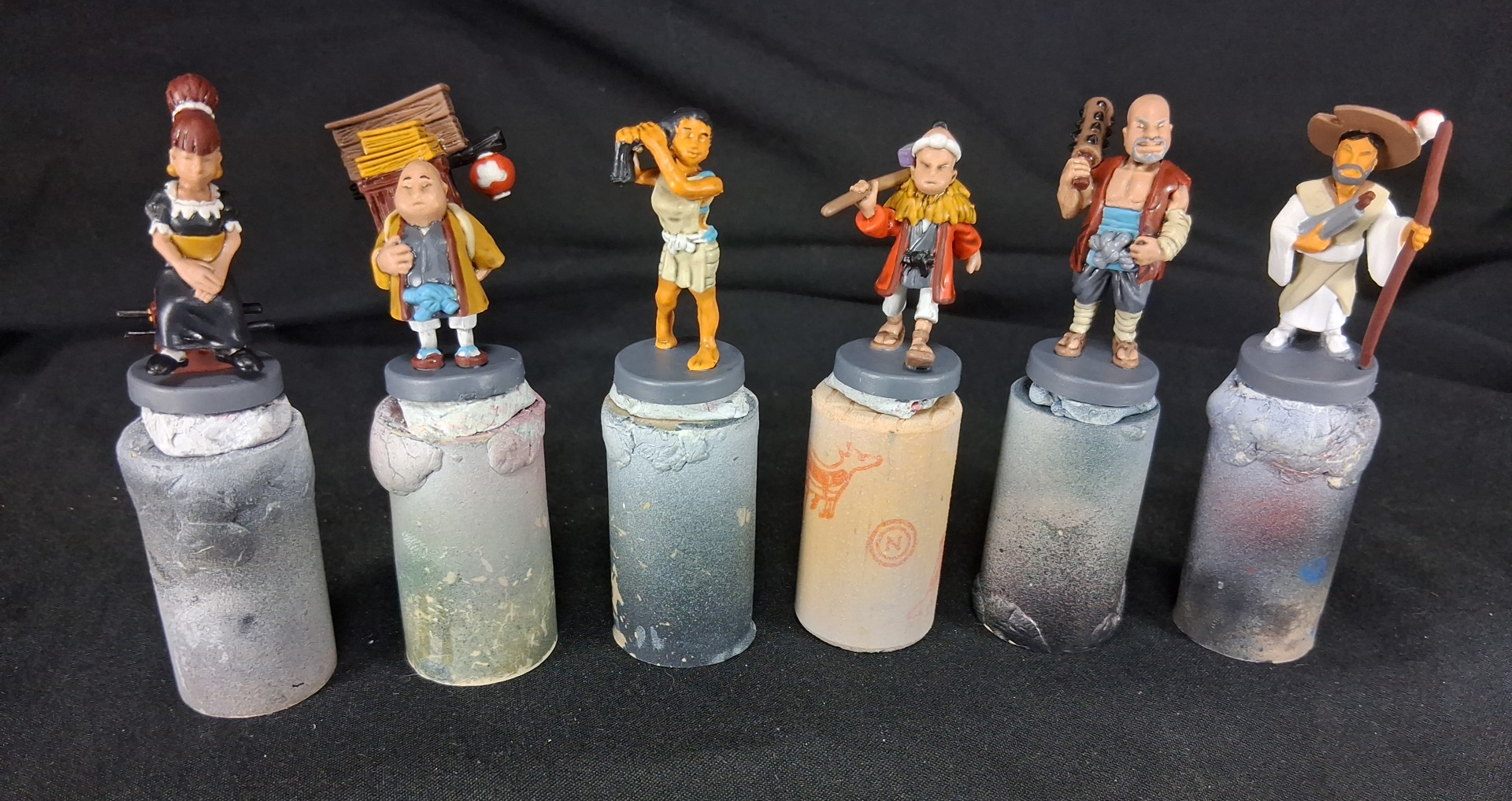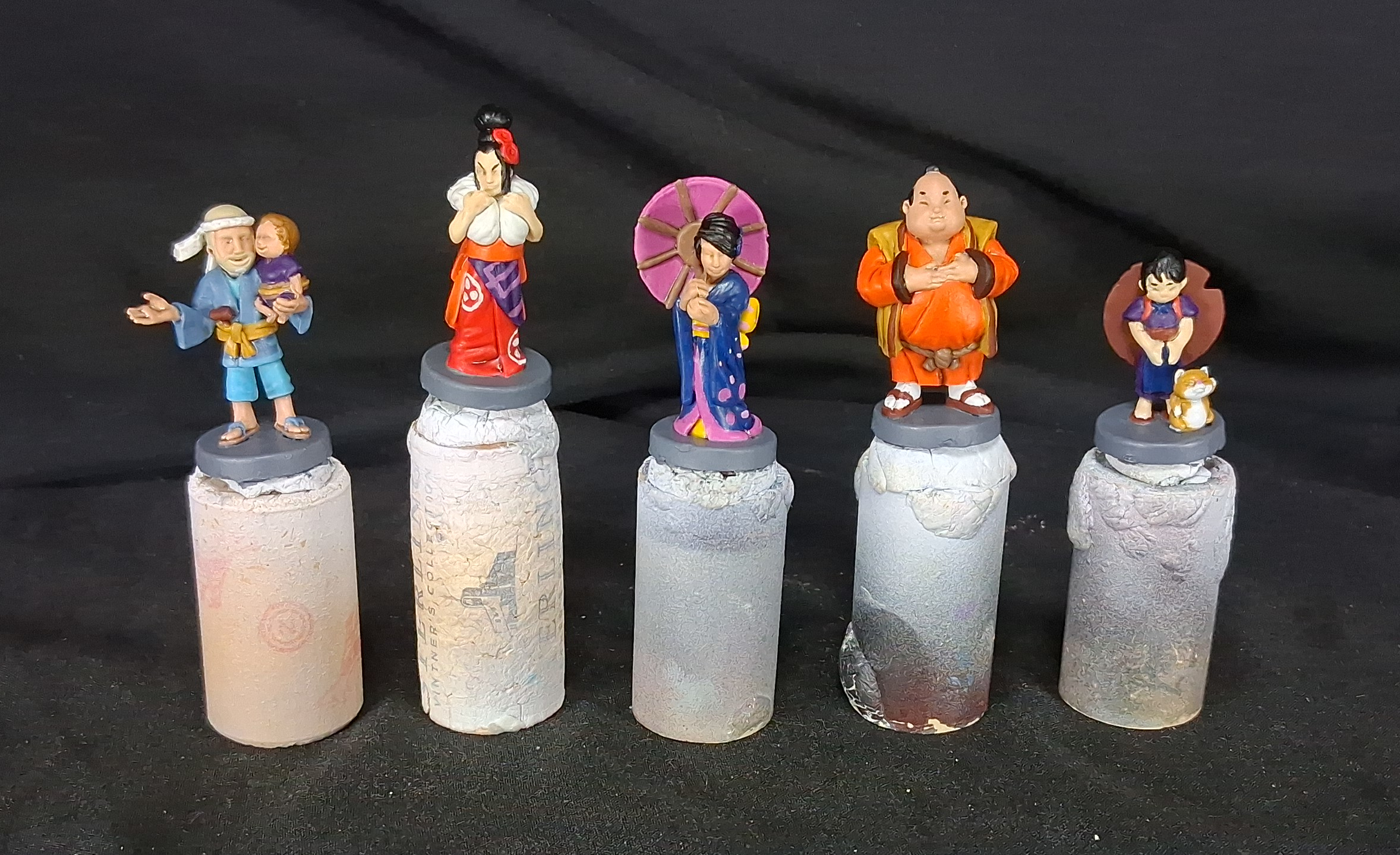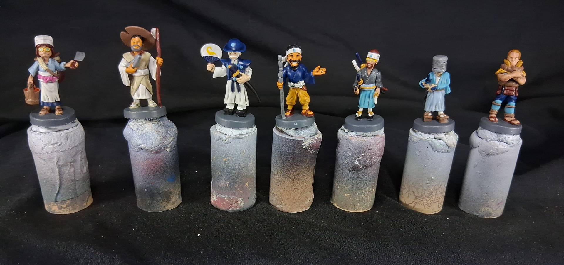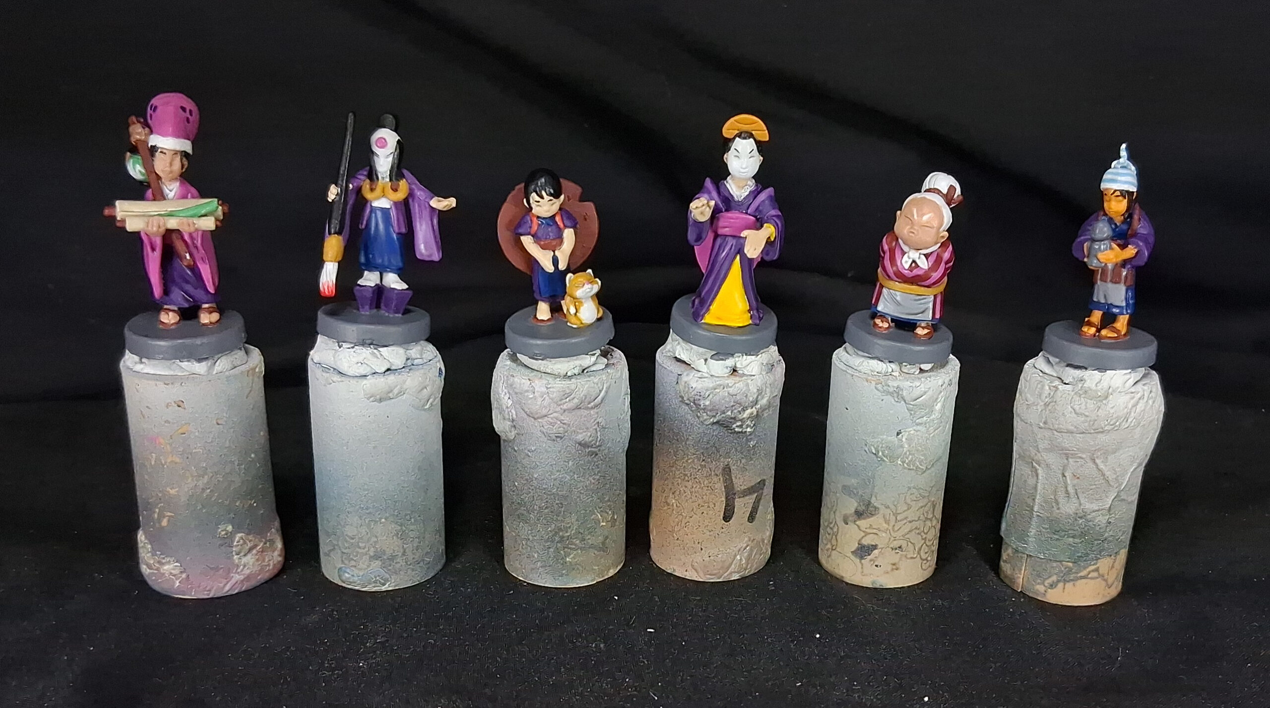 32 game colorful figures for the board game "Tokaido". I've actually done two sets of these, both pictured as well as some works in progress for both.